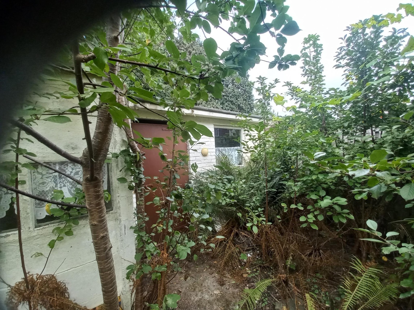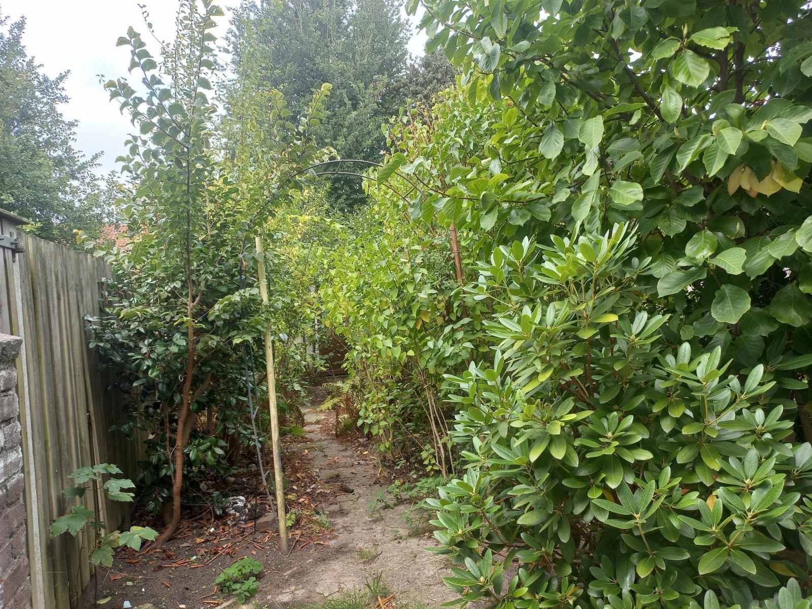 Achtertuin met achterom gelegen op het westen. De tuin is voorzien van een overdekt achterom, terras en vaste groene beplanting.