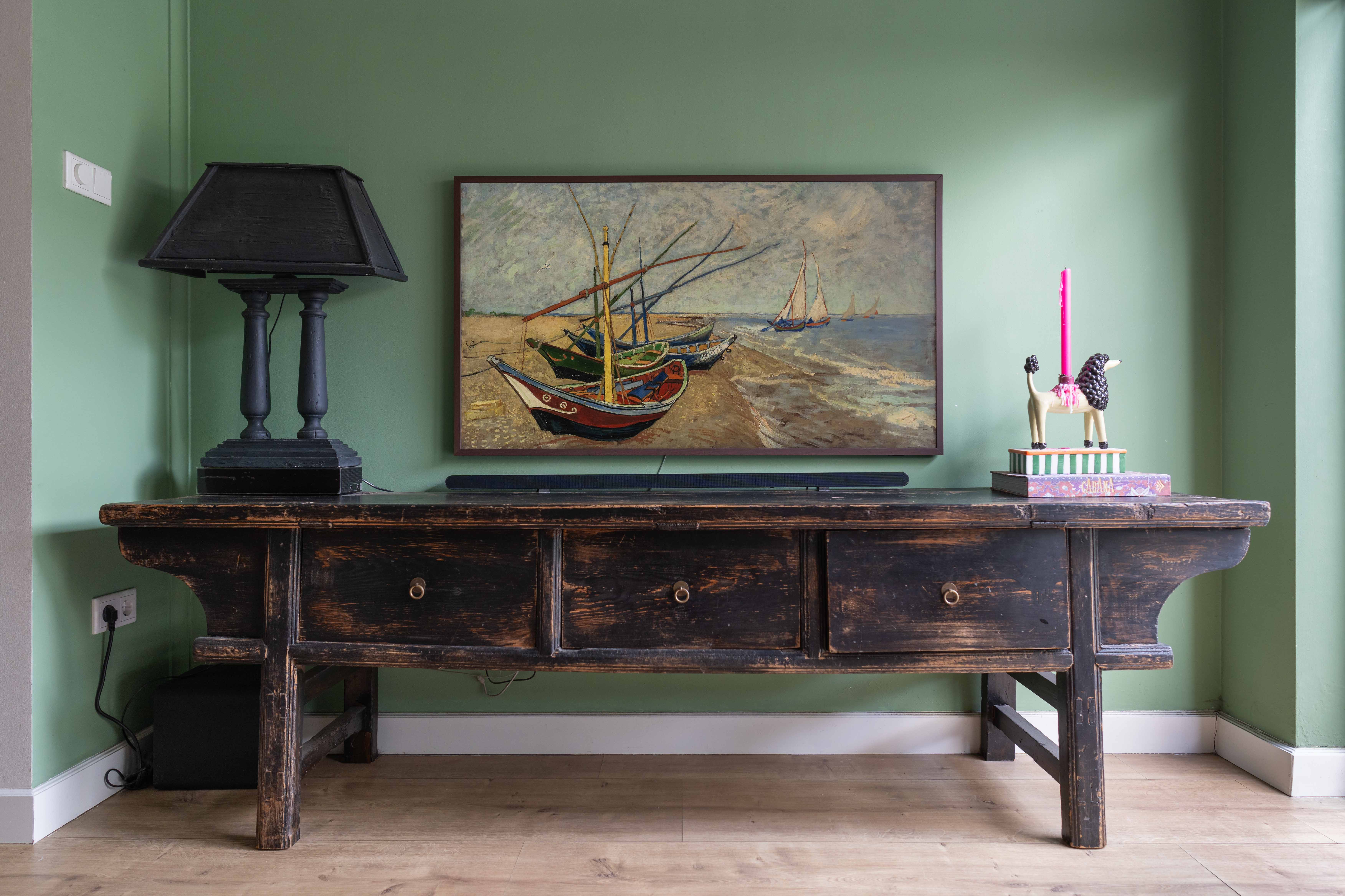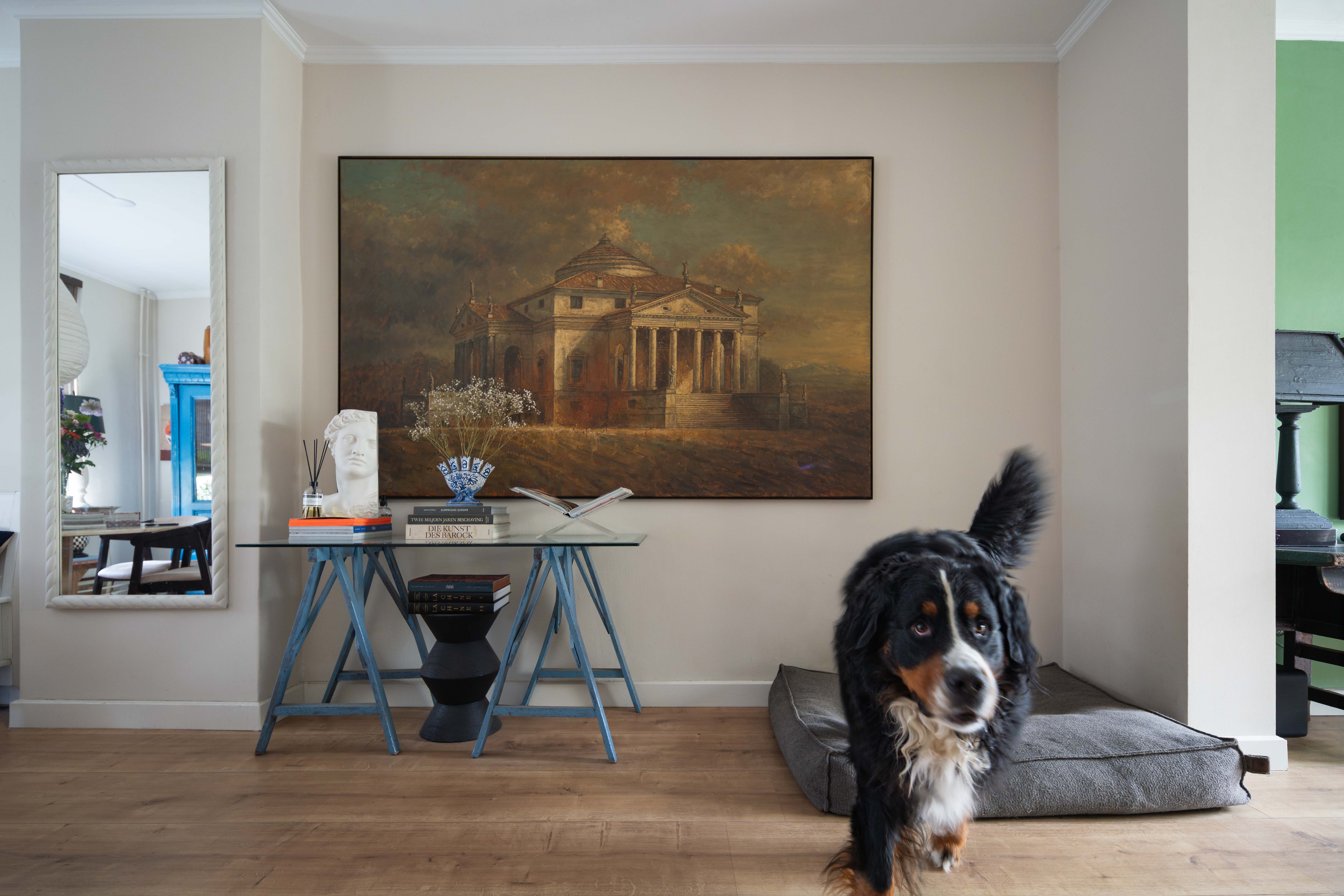 Het pronkstuk? Een groot schilderij dat de woonkamer domineert. “Ik was al lang op zoek naar iets dat die enorme muur compleet zou maken. Toen ik dit per toeval op Marktplaats vond, wist ik: dit is het. De maat was perfect.” Op het doek staat de Italiaanse Villa Rotonda, een meesterwerk uit de hoog renaissance. Eline’s droom: het indrukwekkende bouwwerk ooit in het echt, ín Italië te bewonderen.