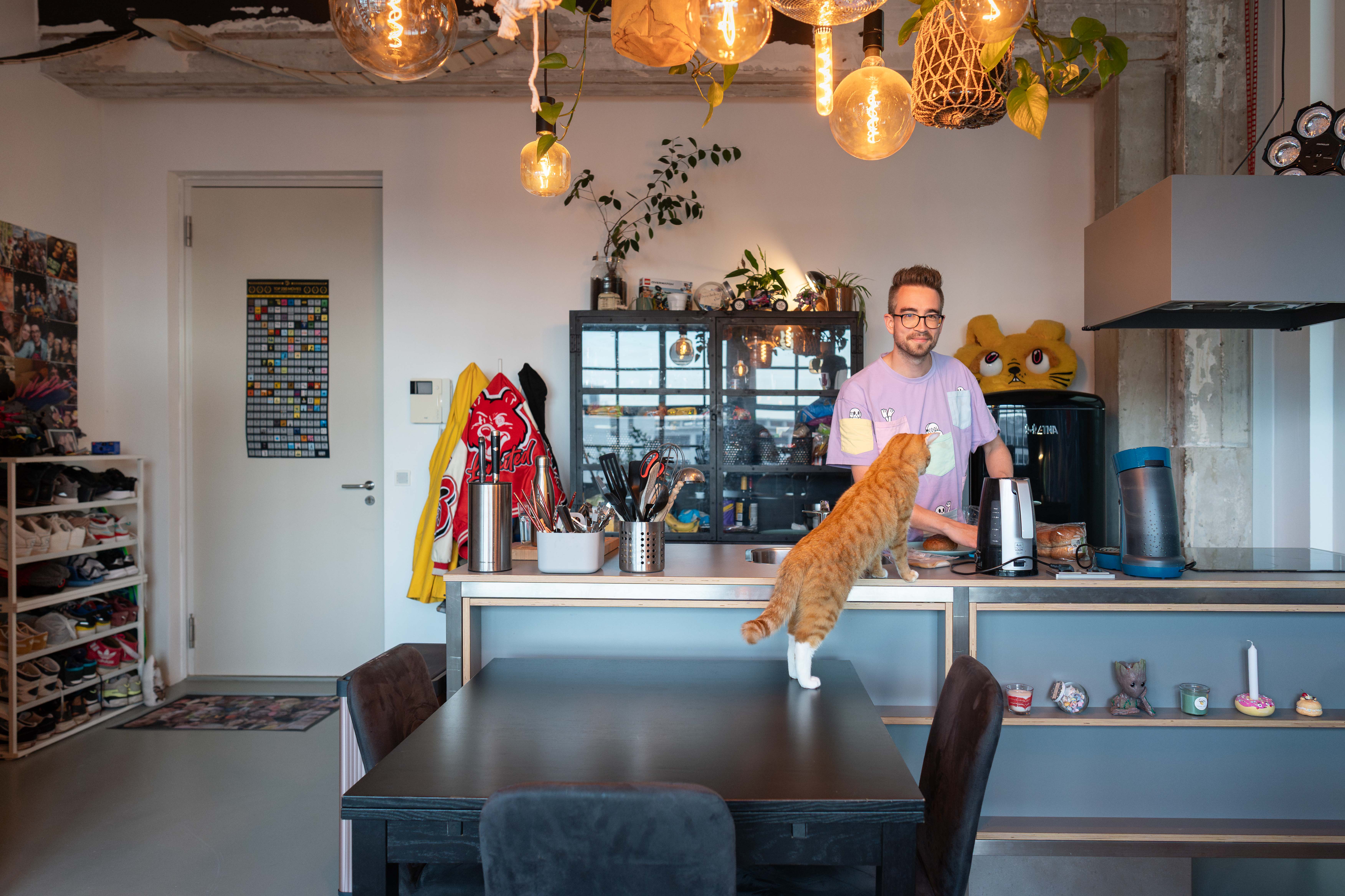 Er was een hoop werk te verrichten toen Wouter in zijn Slimmer Kopen®-loft trok. Het kostte hem twee hele dagen om een ‘bakstenen’ muur van piepschuim van de vorige bewoner te verwijderen, maar het resultaat mag er zijn. Toen zijn kat Noodle al vrij snel ging chillen op de vensterbank in de zon, voelde Wouter zich écht thuis.