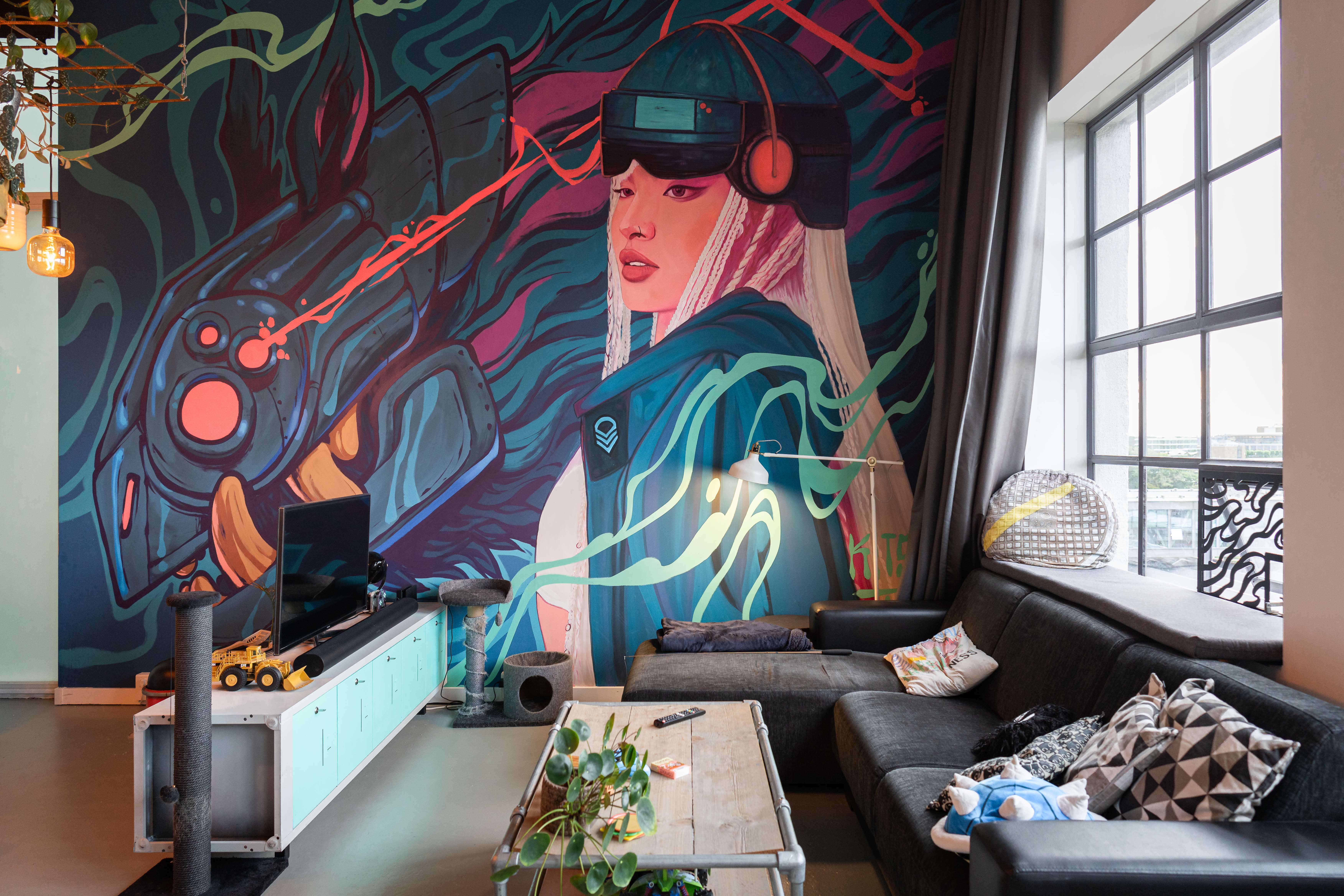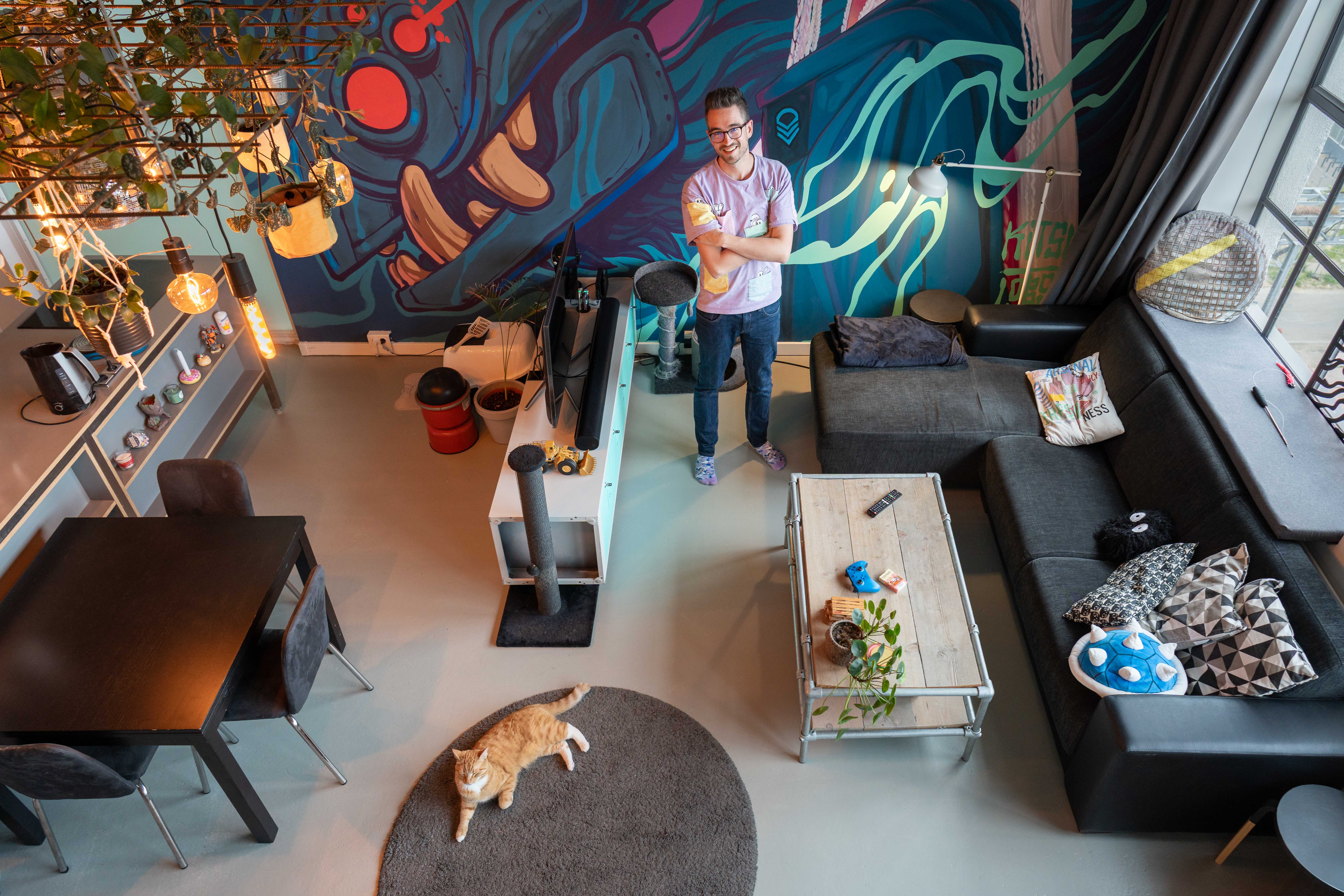 Eyecatcher in de woning van Wouter is de enorme muurschildering die een hele wand beslaat. Het kunstwerk is gemaakt door bevriende kunstenaars (@Kitsunejolene en @lobster_robin).