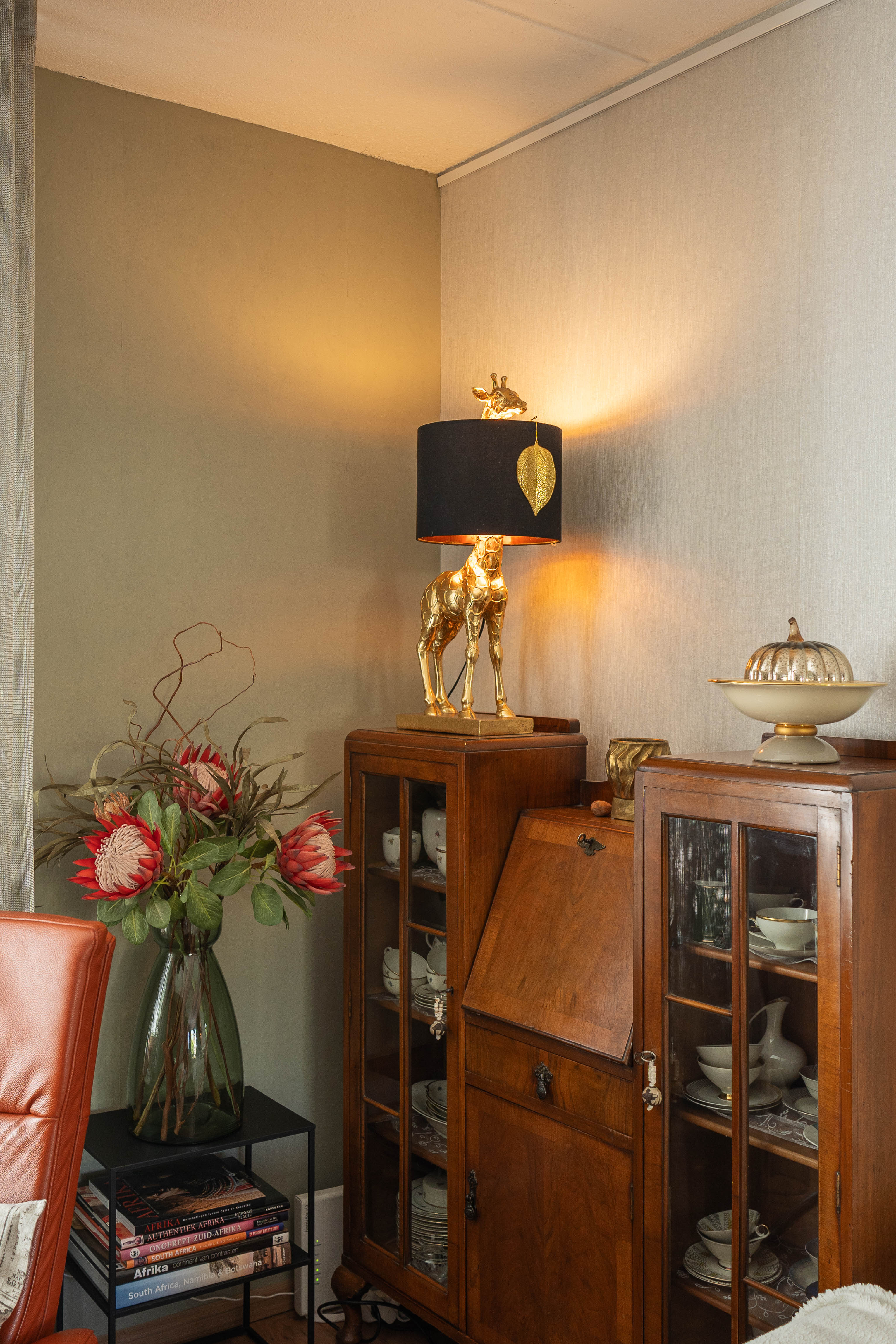Wie bij Toni over de drempel stapt, merkt meteen dat haar huis meer is dan alleen een plek om te wonen. “Het is echt mijn eigen stek,” glimlacht ze. “De omgeving, de ruimte, de lichtinval, alles klopt gewoon. Binnen heb ik mijn twee culturen samengebracht. In de gang hangen Afrikaanse kunstvoorwerpen, in de woonkamer staat Delfts blauw. En overal staan vetplanten uit Zuid-Afrika, die doen me denken aan mijn jeugd.”